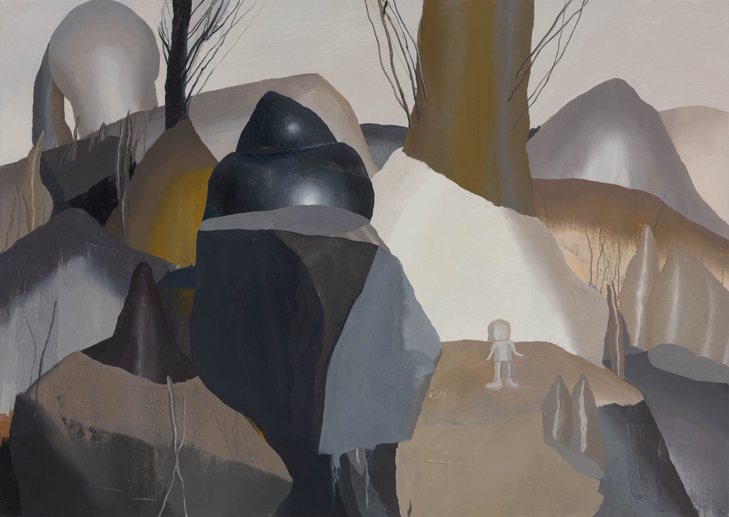 正如这张《魂魄》,并不着力于再现一个可供进入和栖居的世界,而是将自然的符号转化为一种不断向外生长、向内凝聚的精神场域。画面中冷峻而不规则的几何块面如山石般彼此挤压、堆叠、切割;右侧微小的人形像一缕幽微之光,从“魄”的沉积浮现出“魂”的感应。当我们回看现代主义的进程时,会发现其在解放形式的同时,也不可避免地固化了主体与客体、感性与理性、内部体验与外部形式之间的分离。而尹齐的实践,则试图从这些裂缝的根源处——我们被现代性规训的知觉方式本身开始工作,让看似失序的一切重新联结与弥合。